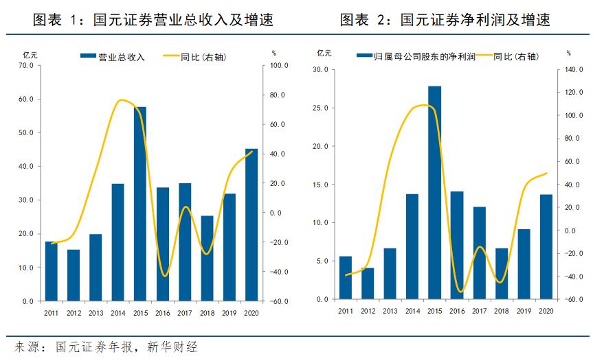 2020年,国元证券实现经营业绩大幅增长,且收入和利润增速明显高于行业平均水平。2020年公司营业收入45.29亿元,同比增长41.57%,归属于母公司股东的净利润13.70亿元,同比增长49.84%。而根据中国证券业协会数据,2020年我国证券行业营业收入、净利润同比增速分别为24.41%、27.98%,国元证券业绩增速明显跑赢行业。过去两年,伴随着我国资本市场的改革提速和高质量发展,国元证券的业绩也在加速成长,2020年营收和利润同比增速达到2016年以来最高水平。