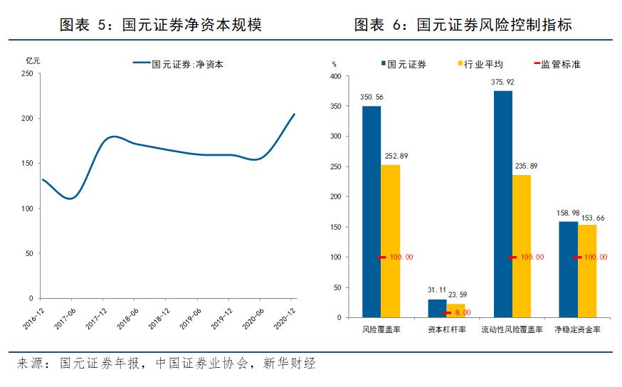 风险管理方面,国元证券杠杆率较低,资产流动性较强,资产配置较为合理,各项风险控制指标均优于监管预警标准,且高于行业平均水平。2020年国元证券净资本204.82亿元,同比增长28.72%;净资本与净资产之比为69.90%,风险覆盖率350.56%,流动性覆盖率375.92%,净稳定资金率158.98%。根据中国证券业协会数据,截至2020年末,证券行业平均风险覆盖率252.34%,平均资本杠杆率23.59%,平均流动性风险覆盖率235.89%,平均净稳定资金率153.66%,行业整体风控指标优于监管标准。