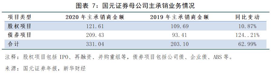 具体来看,2020年国元证券母公司完成22个股权项目,完成30个债券项目,合计主承销规模331.04亿元,再创历史新高,同比增长62.99%。其中,债券项目主承销规模209.43亿元,同比增长124.21%,实现跨越式增长。