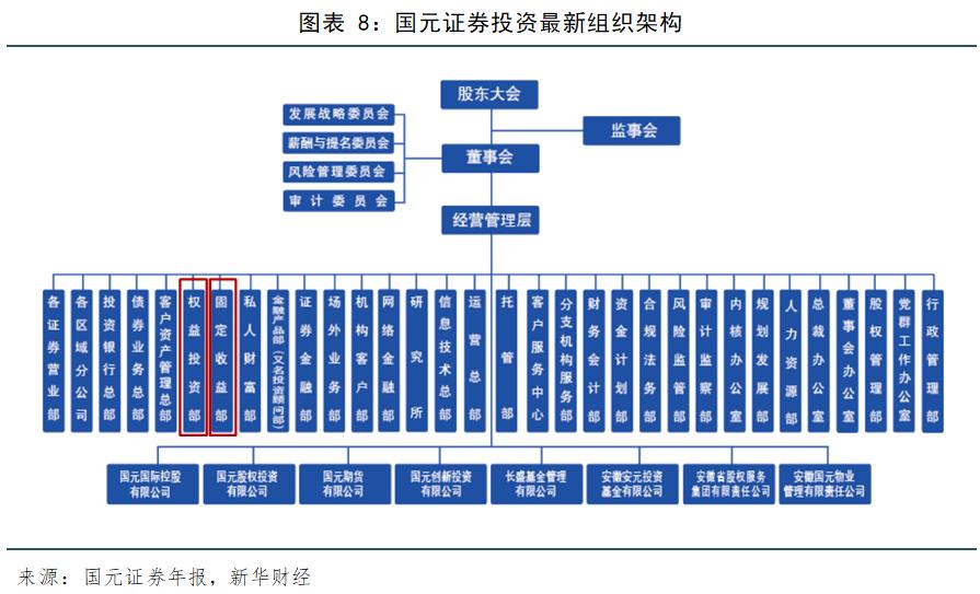 自营业务的高速成长,一方面得益于2020年证券市场的强劲表现;另一方面,国元证券对自营业务的高度重视也是重要因素。2020年国元证券完成“两会一层”换届选举,以及两轮14个部门的组织机构变革,自营业务组织架构也迎来大调整:原投资管理总部更名为权益投资部,同时单独设立固定收益部。调整后的权益投资业务和固收投资业务实现“分而治之”、独立运作,发展模式向头部券商看齐。这有利于进一步优化自营业务结构,做强做优固收业务,对提升自营投资资产获取、风险定价和主动管理能力,提高业绩贡献度有很大的促进意义。
