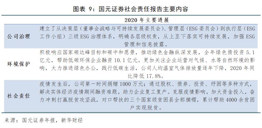 公司治理方面,国元证券积极响应监管趋势与行业发展趋势,已把ESG纳入公司治理,建立了从决策层(董事会战略与可持续发展委员会)、管理层(ESG委员会)到执行层(ESG工作小组)三级ESG治理体系,明确各层级权责,从上至下落实可持续发展,加强ESG管理和信息披露,推动ESG理念和战略融入公司经营管理与业务发展。环境保护方面,公司积极响应国家碳达峰目标和碳中和愿景,推动绿色金融纵深发展,全年绿色债投资5.1亿元,帮助低碳环保企业融资10.1亿元。大力推进绿色办公,践行低碳生活公司人均温室气体排放量逐年下降,2020年同比降低17.8%。社会责任方面,大力支持疫情防控和实体经济恢复,通过“投行+投资”“股权+债券”“质押+纾困”“场内+场外”“期货+保险”等方式,为实体经济提供投融资综合一站式金融服务,为各类企业提供直接融资500多亿元。奋力冲刺打赢脱贫攻坚战,对口帮扶的三个国家级贫困县全部摘帽,累计帮助4000余贫困户实现脱贫。