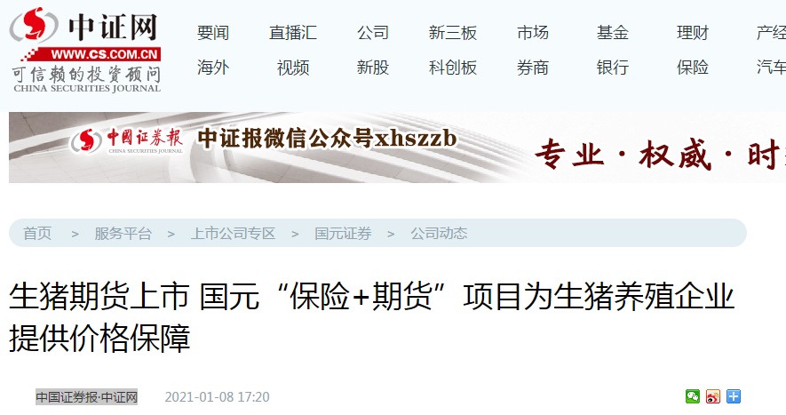 【媒体关注】中证网刊发《生猪期货上市 国元“保险+期货”项目为生猪养殖企业提供价格保障》
