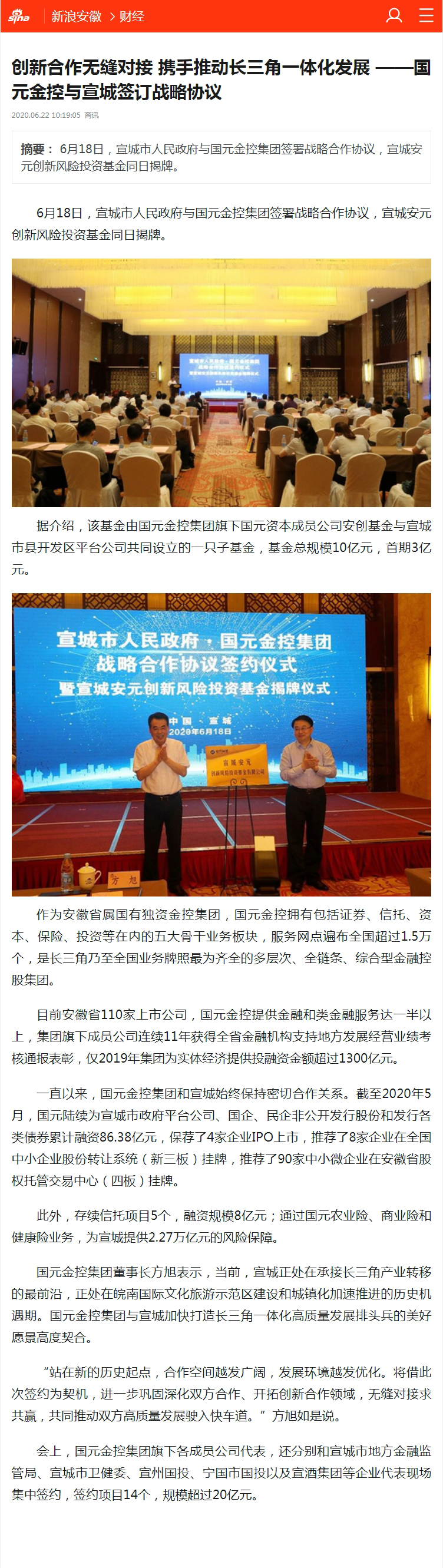 【媒体关注】新浪安徽刊发《创新合作无缝对接 携手推动长三角一体化发展 ——国元金控与宣城签订战略议》