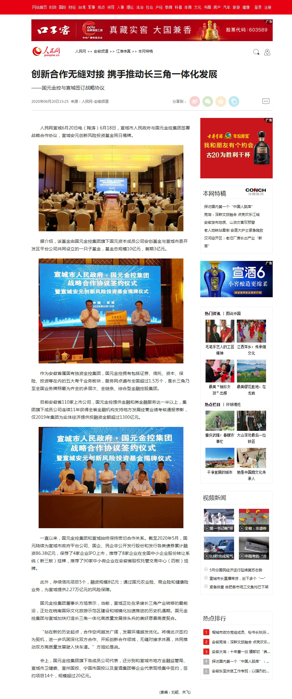 【媒体关注】人民网刊发《创新合作无缝对接 携手推动长三角一体化发展——国元金控与宣城签订战略协议》