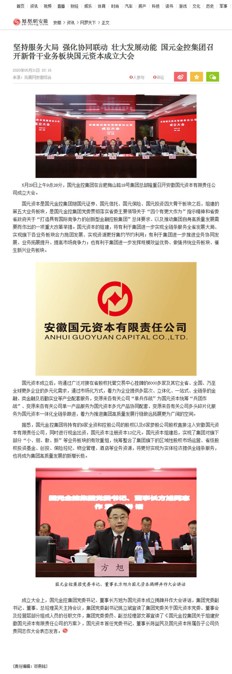 【媒体关注】凤凰网安徽刊发《坚持服务大局 强化协同联动 壮大发展动能 星空官方网站-星空xingkong(中国) 召开新骨干业务板块 国元资本成立大会》