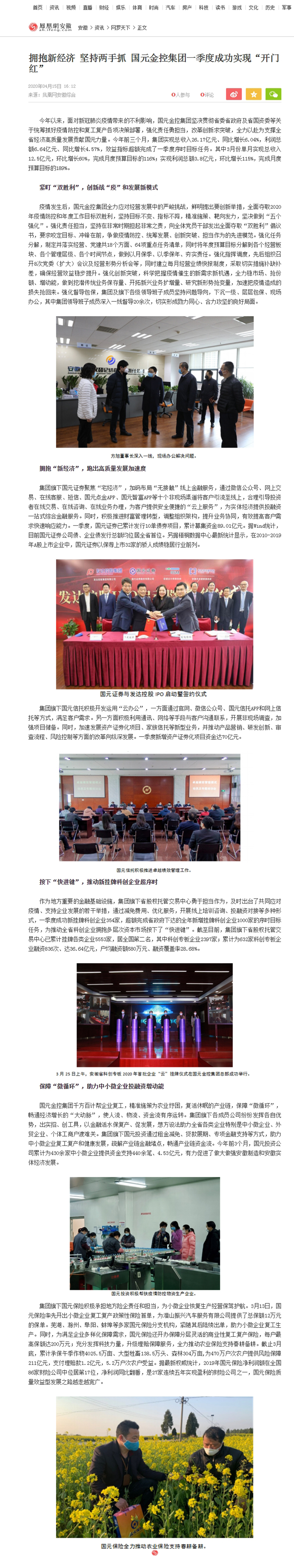 星空官方网站-星空xingkong(中国) 千方百计帮企业复工,精准施策为农业纾困,复活休眠的产业链,保障“微循环”,畅通经济增长的“大动脉”,使人流、物流、资金流有序运转。集团旗下各成员公司纷纷发挥各自优势,出实招、创工具,以金融活水保复产、促发展,想方设法助力全省各类企业特别是中小微企业、外贸企业、个体工商户渡难关。集团旗下国元投资通过租金减免、贷款展期、专项金融支持等方式,助力中小微企业复工复产和健康发展,疏解产业链金融堵点,畅通产业链资金流。今年前3个月,国元投资公司累计为430余家中小微企业提供资金支持440余笔、4.53亿元,有力促进了做大做强安徽制造和安徽实体经济发展。集团旗下国元保险积极承担地方险企责任和担当,为集团旗下国元保险积极承担地方险企责任和担当,为小微企业恢复生产经营保驾护航。3月13日,国元保险率先开出小微企业复工复产政策性保险首单,为潜山振兴汽车服务有限公司提供了总保额12万元的保单。芜湖、滁州、阜阳、蚌埠等多家国元保险分支机构,紧随其后陆续出单,助力小微企业复工生产。同时,为满足企业多样化保障需求,国元保险还开办保障分层灵活的商业性复工复产保险,每户最高保额达200万元;充分发挥科技力量,升级理赔保障服务,全力推动农业保险支持春耕备耕。截止3月底,累计承保午季作物4025.5万亩、大型牲畜138.5万头、森林304万亩,为470万户次农户提供风险保障211亿元,支付理赔款1.2亿元,5.2万户次农户受益。据最新权威统计,2019年国元保险净利润额在全国86家财险公司中位居第17位,净利润同比翻番,是27家连续五年实现盈利的财险公司之一,国元保险质量效益型发展之路越走越宽广。