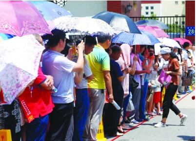 昨日,合肥进入入夏以来体感温度和太阳最毒辣的一天。相比于高考送考的家长,中考家长要受一些罪。从早上8点半语文开考到下午17时物理化学科目结束,不少在考场外等待孩子出来的家长只能在太阳下等待,有些考点如外国语学校门口绿化环境较好,大家就躲在树荫底下聊天。